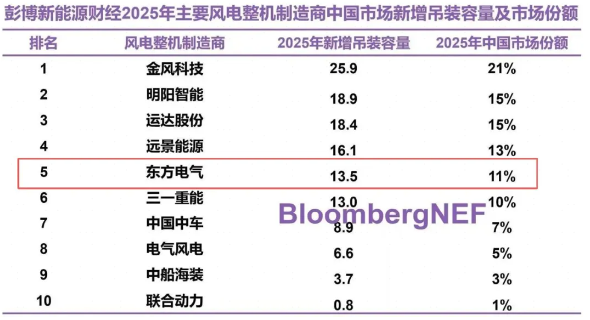 東方風(fēng)電國(guó)內(nèi)新增吊裝容量排名第五!